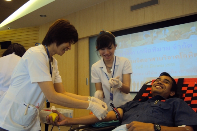 Manager and employees of Pimai Salt Factory. Participated blood donation at Reception Room Pimai Salt Factory Nakhonratchasima for Phimai Hospital on March 21, 2012