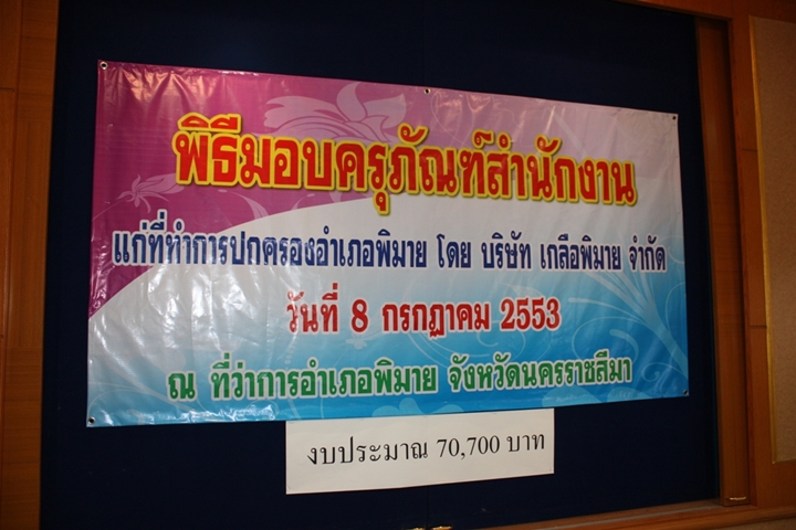 นายอรุณ อินเจริญศักดิ์ ผู้อำนวยการโรงงาน บริษัท เกลือพิมาย จำกัด มอบอุปกรณ์สำนักงาน (เครื่องปรับอากาศ เครื่องถ่ายเอกสาร และเครื่องคอมพิวเตอร์) ให้แก่นายอำเภอพิมายในวันที่ 8 กรกฏาคม 2553 เพื่ออำนวยความสะดวกในการปฏิบัติงานและให้บริการประชาชน
